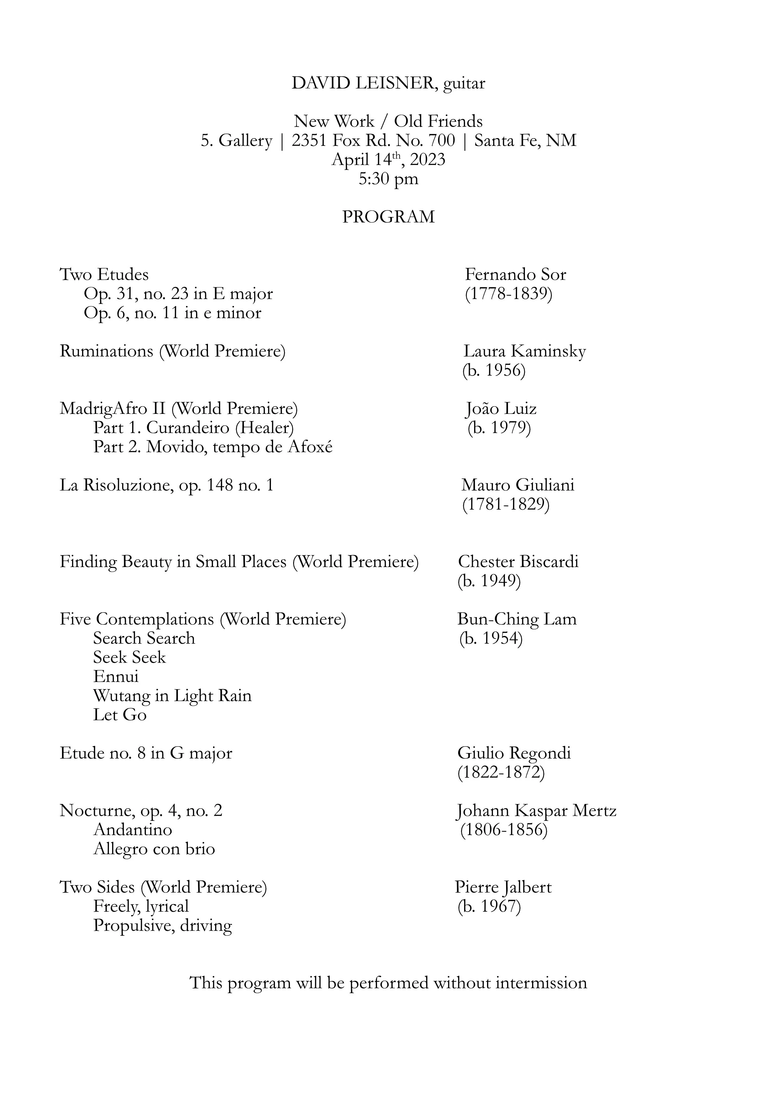 Five newly commissioned, short works, plus music from Leisner’s latest solo album of 19th-century guitar pieces.